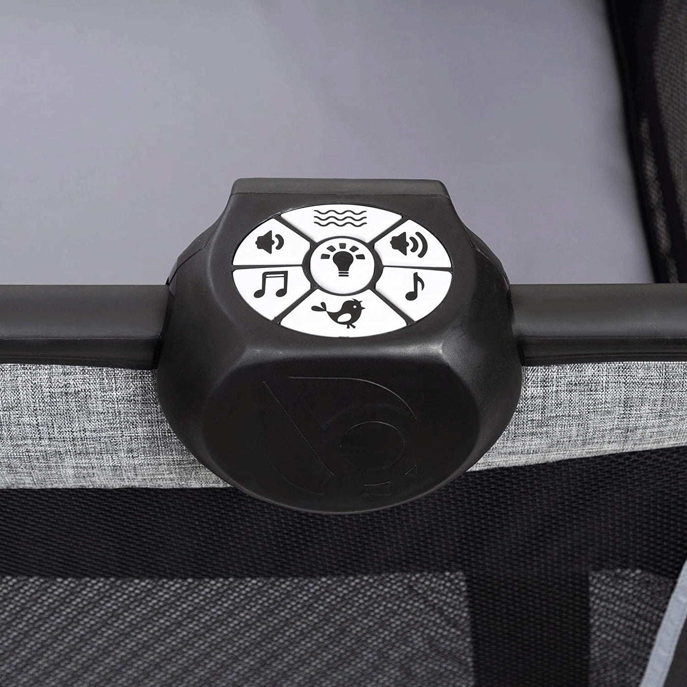 Nursery center with plush fabric lining includes electronic music center with volume control, a nightlight, and vibration