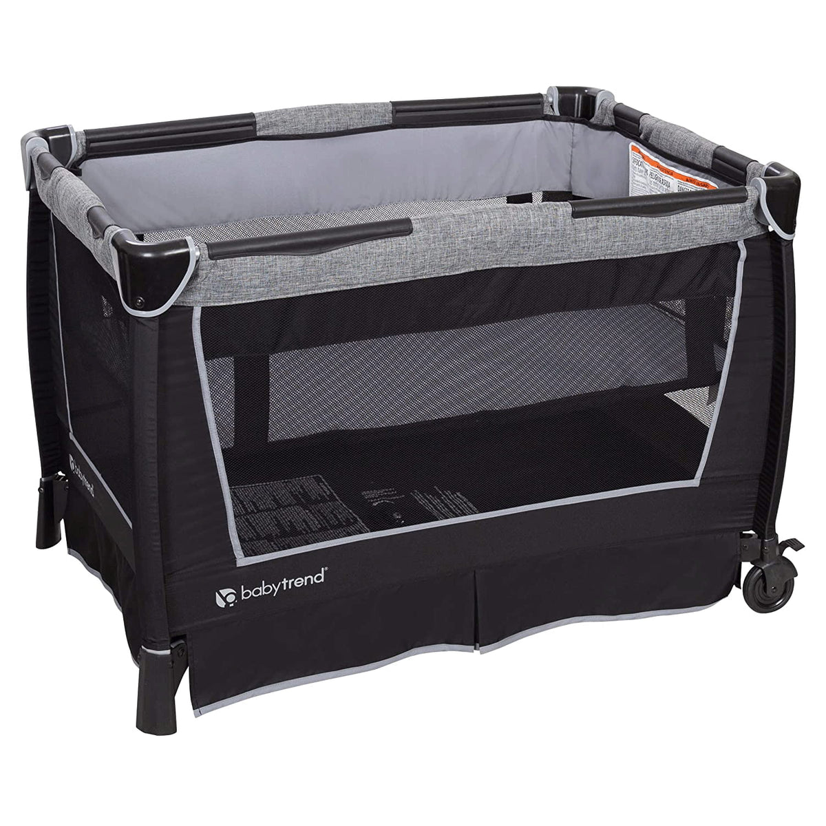 The Baby Trend Retreat Nursery Center has just about everything you need to keep your baby happy, clean, and safe. This portable playard includes two removable full lay flat bassinets, changing table, and a deluxe organizer for diapers, wipes, toys, and outfits. The removable Rock-a-Bye Bassinet features a canopy and handle; this deluxe bassinet can even turn into a standalone rocker to help your little one relax and sleep. The plush, fabric-lined playard has mesh sides for proper ventilation. Move the foldable playard from place to place with its large wheels, and lock the brakes in place with 1 hand. A carrying bag is included for easy transport or storage. Fun and practical, the Baby Trend Nursery Center features an electronic music center to keep babies entertained. This music center has buttons for volume control, a nightlight, and vibration. There are 2 styles of music as well as nature sounds, giving your little one plenty of options. Designed for little ones aged 0 to 24 months, the Baby Trend Nursery Center has everything you need to care for and entertain your baby or toddler.