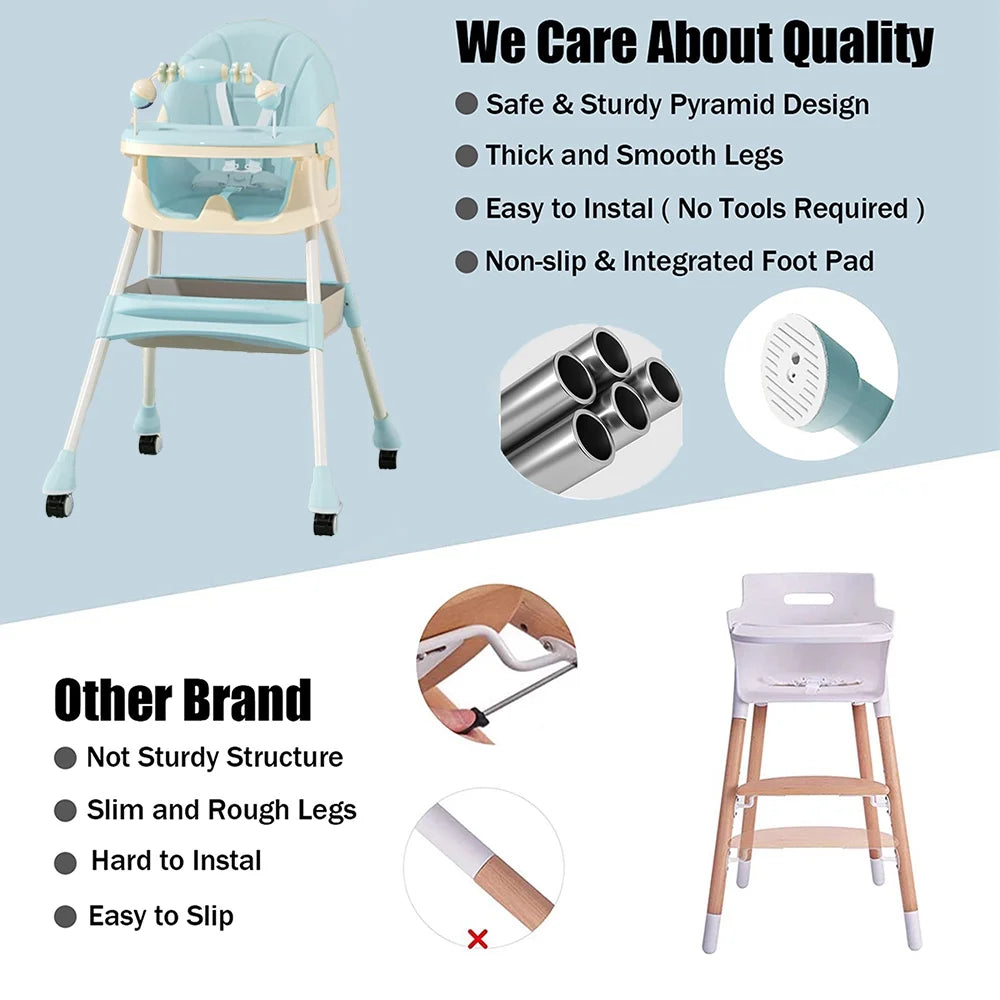 Liyufly unisex kids highchair is made of thickened heavy duty stainless steel for durability, shock absorption and load bearing. Its seat is made of PP material that helps to provide fatigue resistance and provide maximum comfort. The sturdy construction provides comfort, stability and ergonomics for your baby. 4 in 1 products - baby high chairs, baby high chairs and trays, toddler chairs, and large children's tables and chairs to suit every stage of your child's growth. Keep your baby safe and comfortable with the 5-point harness, 10.8 lb. Easy-to-clean seat with wipeable EVA foam seat cushion. The straps wipe clean and are machine washable. Machine washable seat cushions make cleaning easy. Our high chair includes a double deck that also locks, so you only need to remove the upper deck for cleaning after your baby has eaten, and the lower deck also provides baby play space for your handy toys. There is also a telescopic design next to the seat, and three adjustable positions provide more space and flexibility for fast-growing children.