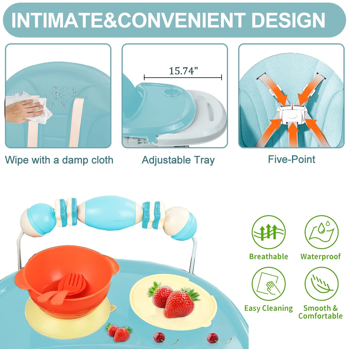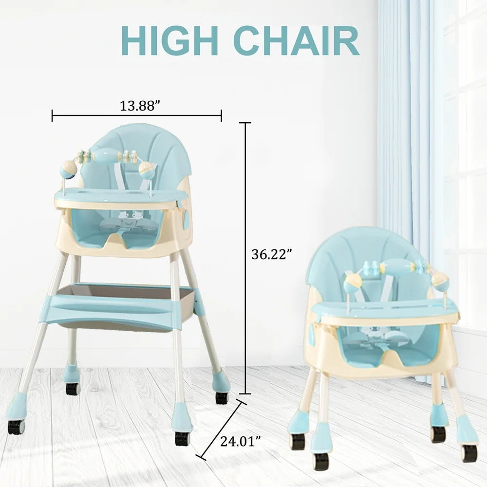 4-In-1 Baby High Chair Portable Baby Toddler Dining Chairs Eat & Play Convertible High Chair with 5-Point Harness, Dinner Plate and Toy Rack, Dark Blue - Dark Blue