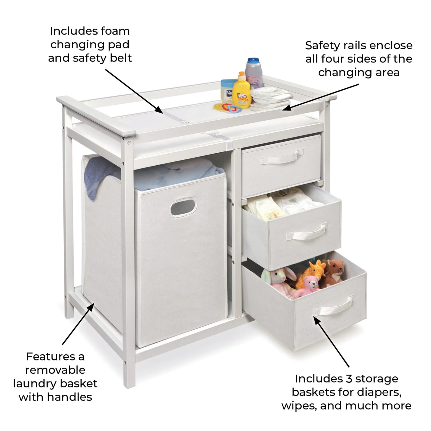 Badger Basket’s Modern Baby Changing Table with Hamper and Three Baskets is a practical and stylish place for diaper changing and getting baby ready for the day. Includes a large hamper and three baskets. Hamper is fully removable leaving you a convenient spot in the changing table for your diaper pail. Includes a changing pad and safety belt, too. When Baby outgrows this table, it becomes a useful piece of furniture for organizing toys and more. Safety rails enclose all four sides around the top of the table. Metal support bar beneath the changing surface provides additional stability. Hamper and baskets fold for storage. Changing Table frame made with multi-layer solid wood, and the shelves are engineered wood with veneer. All paints and finishes are non-toxic. Outside fabric on the baskets is 80% Polyester/20% Cotton. Inside lining on the baskets (including the bottom panel) is non-woven fabric. Changing pad is polyurethane foam covered with wipe clean PEVA (non-PVC) vinyl. Overall unit measures 34.25 inches W x 20.75 inches D x 34.5 inches H. Hamper measures 13.5 inches L x 13.75 inches D x 21.5 inches H. Baskets measure 14.25 inches L x 17 inches W x 7 inches H. Changing pad measures 31.5 inches L x 17.5 inches W x 1 inch H. All measurements approximate. Wipe and spot clean as needed. Basket color depends on color of the table (baskets are either White or Ecru). Changing table is for use with children weighing up to 30 lbs. (13.6 kg). Adult assembly required. Illustrated assembly instructions included. Meets all currently applicable testing standards. Product includes a limited warranty of 30 Days Parts to the original purchaser. Product may vary slightly from shown and described. Props/accessories shown are for illustration purposes only and are not included with the product. Actual color/finish may vary slightly from screen display. This item ships in its original carton that may include a product photo.