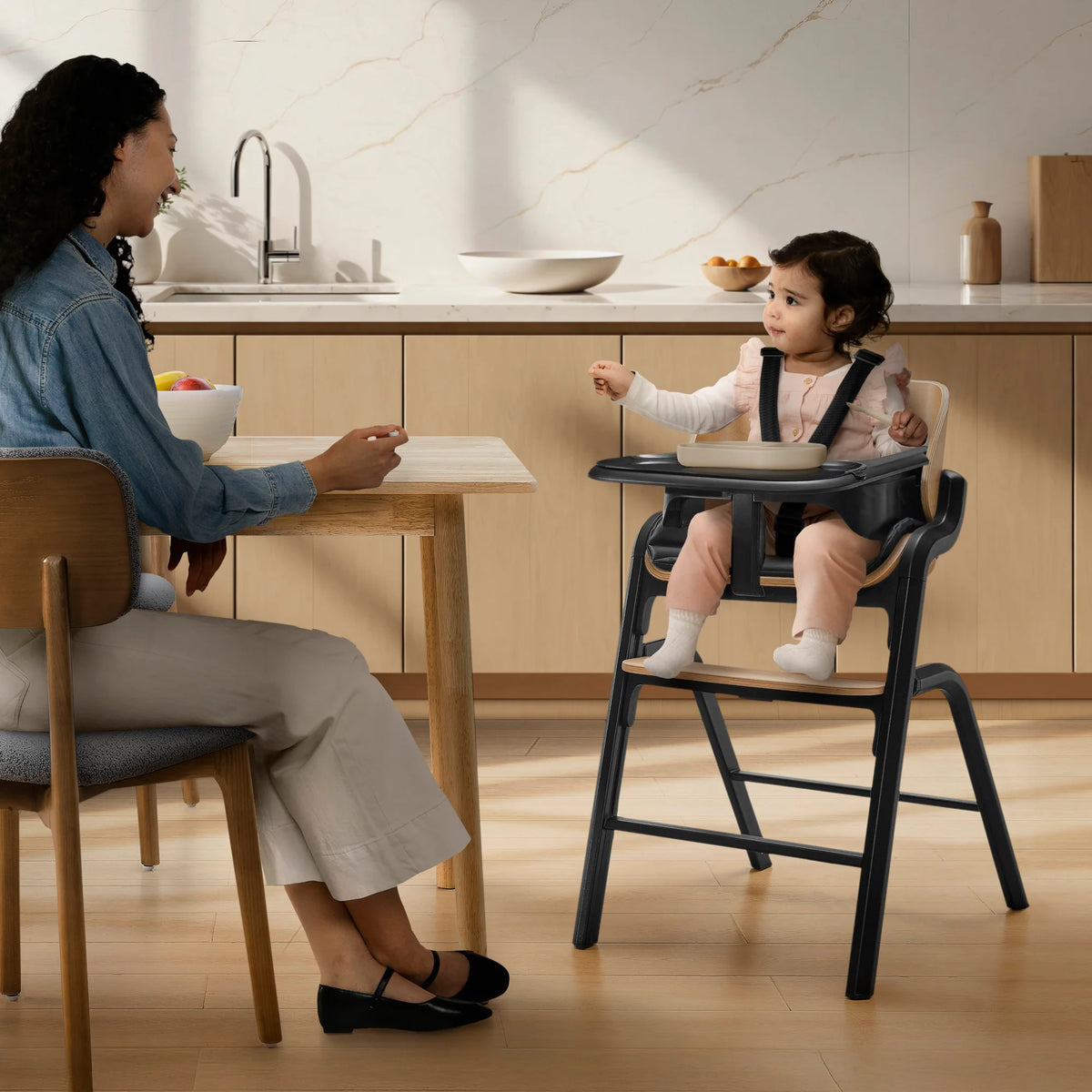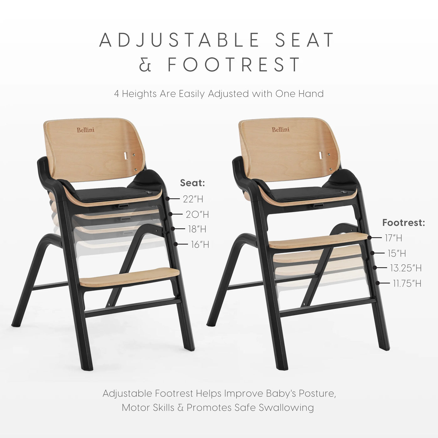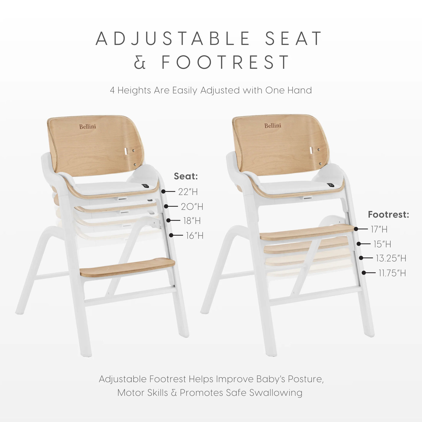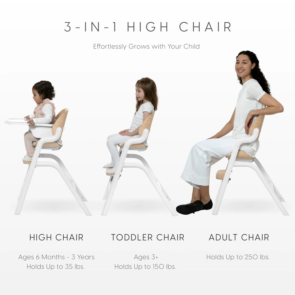 The Bellini Parma 3-in-1 High Chair is there for every moment, from six months all the way up to adulthood. As your child develops, the Parma includes everything needed to transform it from a high chair to a toddler chair, then an adult chair for all ages—it’s the perfect place for your child to eat, discover and grow. The stylish, contemporary design complements your home with its durable aluminum frame and sustainably sourced, FSC-certified beechwood seatback and footrest. Easy to clean, it includes a removable leatherette seat pad and dishwasher-safe tray. Designed for everyday functionality, the Parma features one-hand seat and footrest height adjustments, a 5-point safety harness, and stable, non-slip feet. Sleek, safe, and made to last—this is the only high chair that fits every table and every stage.