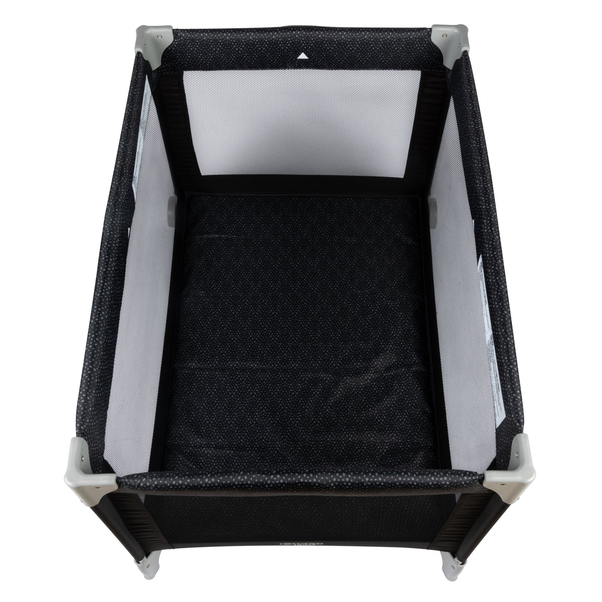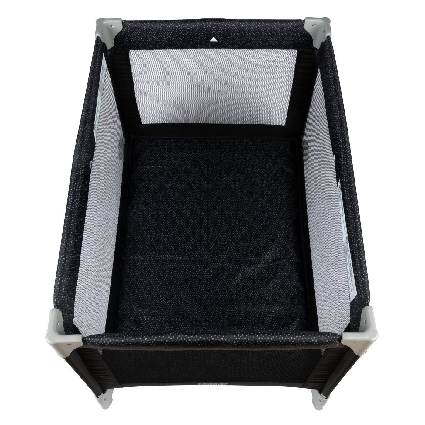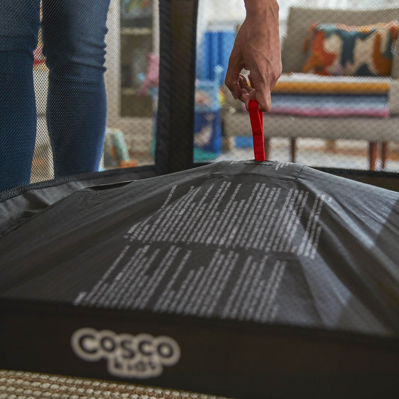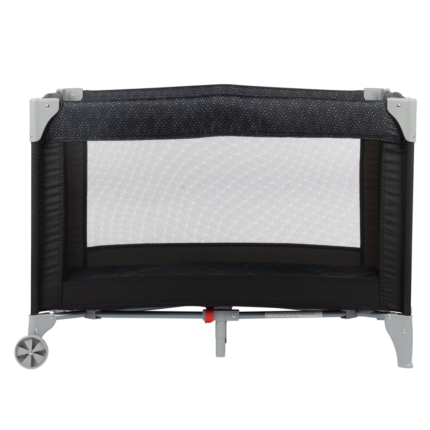 The Cosco Kids Funsport Portable Compact Baby Play Yard with Carry Bag in Noir Dot offers a versatile and reliable space for your infant or toddler to play and rest. This playpen for babies and toddlers is designed to be a compact yet roomy option, providing a fun environment right where you need it. With its 4 mesh sides and padded floor, this playard for babies and toddlers allows your little one full visibility of the world around them and lets you easily keep an eye on them during playtime. The Cosco Kids Funsport can be effortlessly moved around thanks to the convenient wheels on one end, making it a must-have playpen for babies. When traveling, this play yard can be folded compactly into the included carry bag, making it an ideal choice for weekend trips or visits to Grandma's house. This product is designed with a firm, flat sleeping surface that meets the Consumer Product Safety Commission's recommendations for safe sleep.