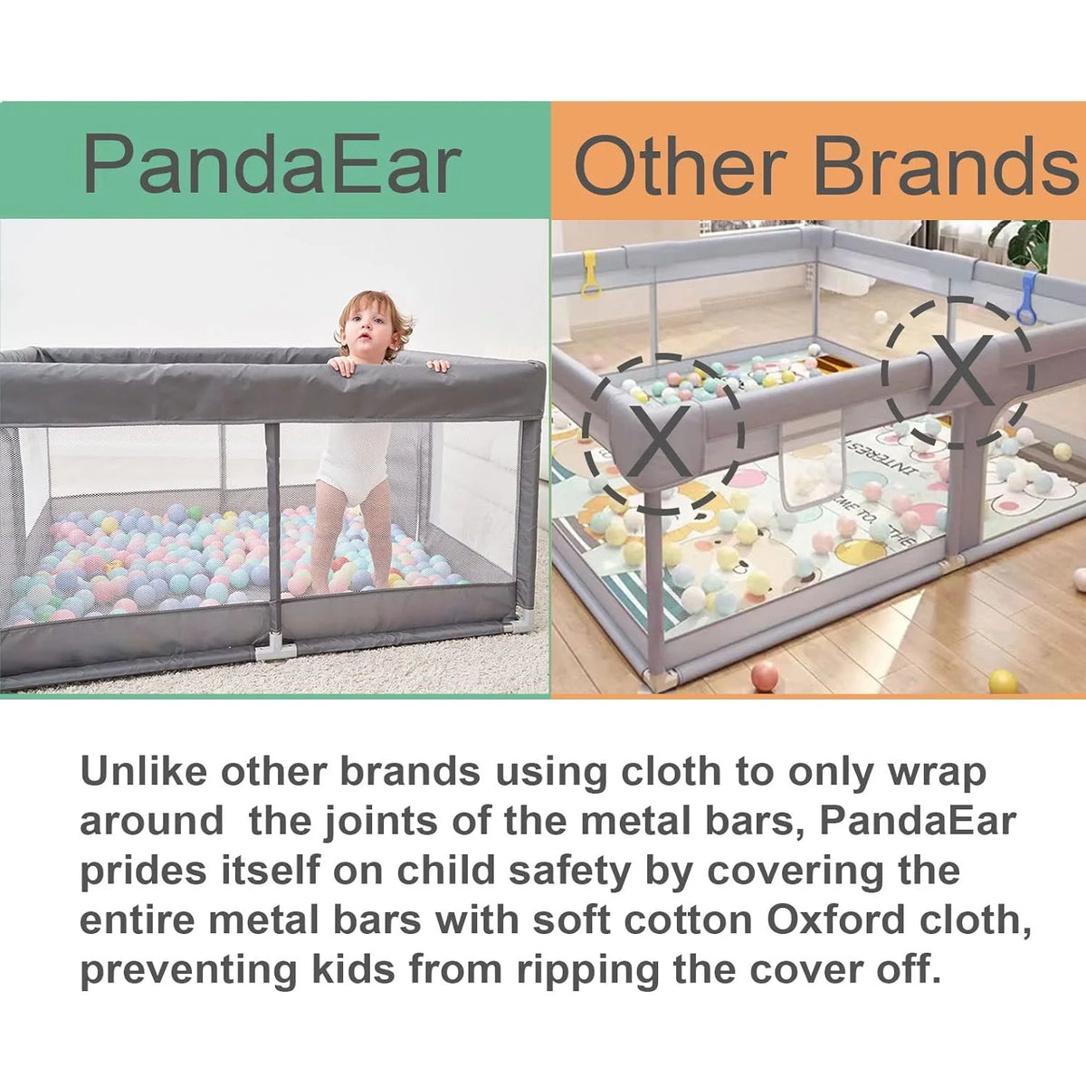 【Extra Safety】Our playpen has two separate doors that you can unzip and allows your child to crawl in and out. The top joints are completely covered by the abrasion-resistant oxford material, which prevents injuries and pinching little fingers.