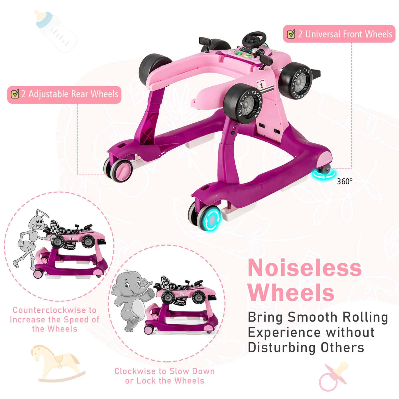 4-In-1 Baby Walker Foldable Activity Walker with Adjustable Height & Speed Purple - Purple
