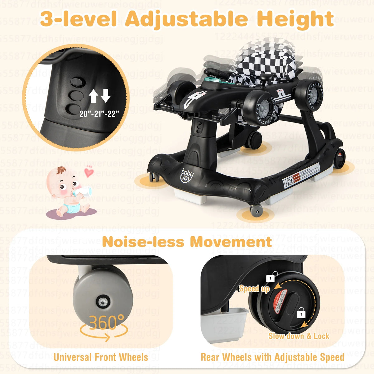 With the simulated racing car shape, the baby walker will be more attractive to kids than others. And the appealing sound and light effect offers more fun to your little one. More importantly, the 4-in-1 versatile design with adjustable height and speed enables the walker to grow with your baby. This baby walker is also quite safe to use, as it’s designed with anti-slip base and safety bumper. Furthermore, with quick-folding design, the walker won’t take up too much space for storage. Feature 4-in-1 multifunctional design meets different demands of baby 3-level adjustable heights (20”/21”/22”) for babies of different heights Ergonomic and padded seat for high-level comfort Seat cushion is detachable and washable Safe to use with back bumper and anti-slip base Steering wheel and music box provide more fun Foldable design for space-saving storage Specification Color: Black Material: PP, Polyester, Sponge Dimension of Unfolding: 29'' x 24'' x 20''/21''/22'' (L x W x H) Dimension of Folding: 29'' x 24'' x 11'' (L x W x H) Net Weight: 10 lbs Weight Capacity: 25 lbs Recommended Age: 6 – 18 Months Battery: 2 AA Batteries (Not Included) Package Includes: 1 x Baby Walker 1 x Instruction