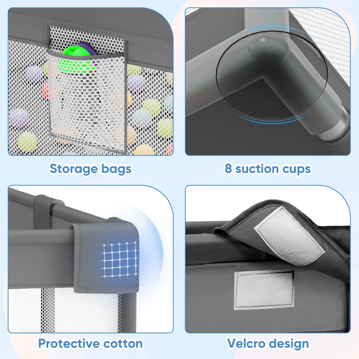 🛡【High-quality Material】:Our toddler playpen is made with safe materials and high-quality Oxford fabric that is soft and durable. A storage pocket on the outside is perfect for holding bottles, diapers, and other essentials. The zippered door allows easy access for your baby, while suction cups at the bottom keep the playpen firmly in place for added safety.